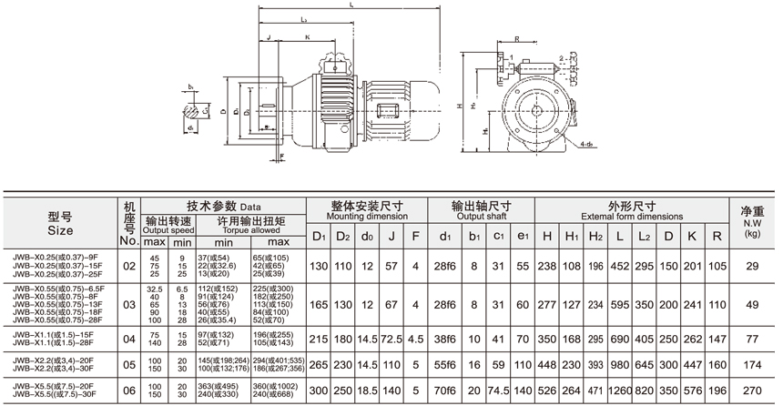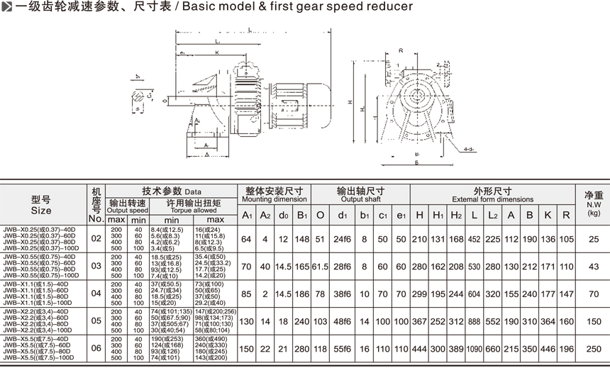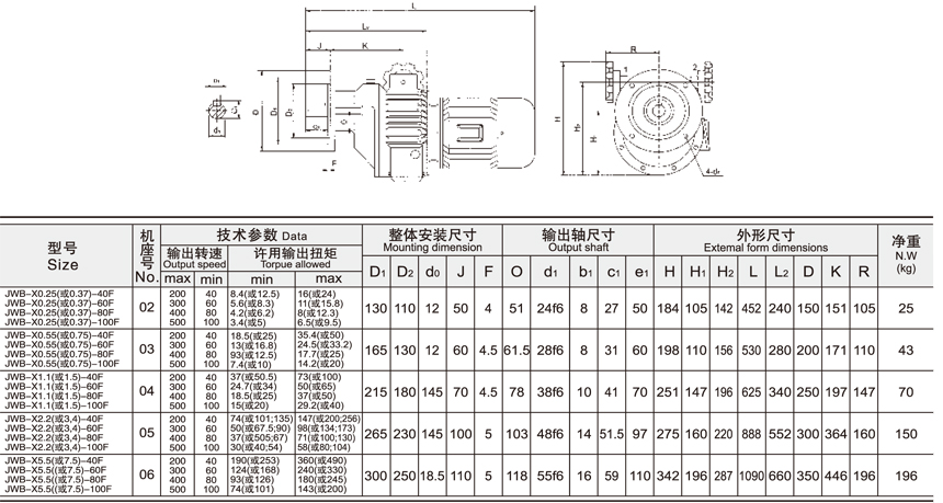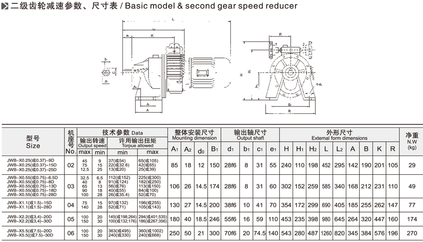 JWB-X系列無級變速機(jī)一級二級參數(shù)與尺寸表